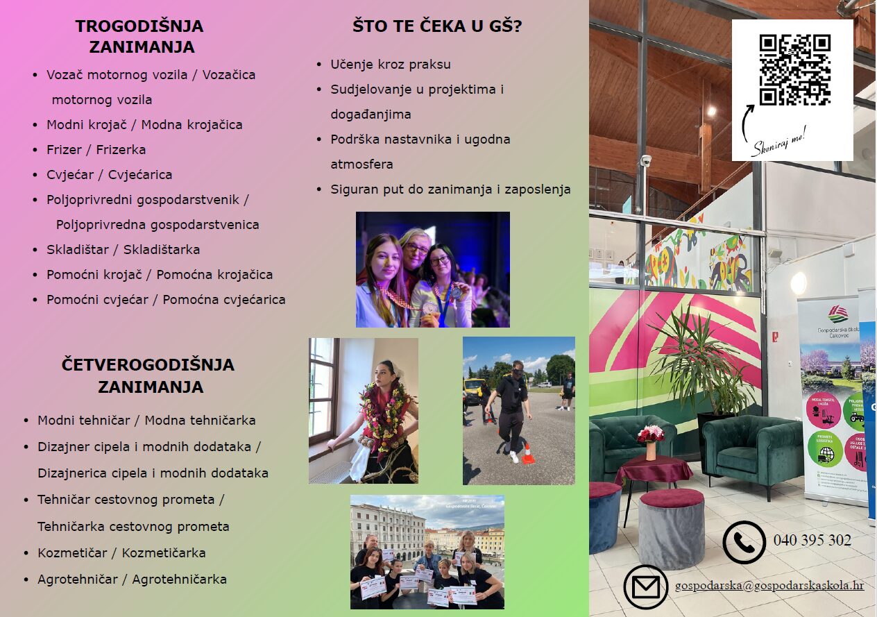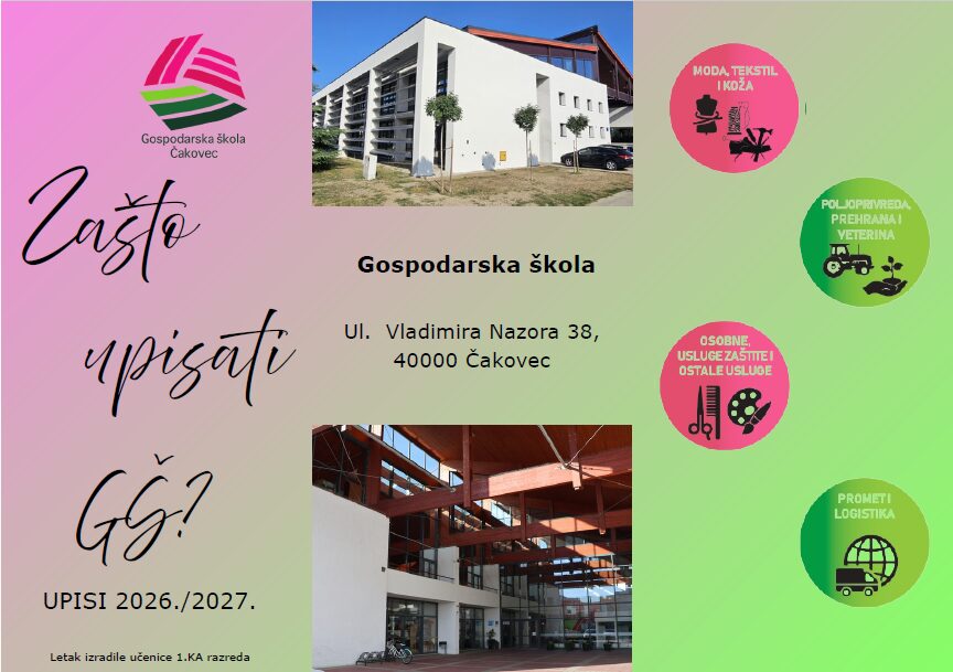 Gospodarska škola iz Čakovca organizira Dan otvorenih vrata koji će se održati 5. svibnja 2026. godine u prostorima škole na adresi Vladimira Nazora 38, Čakovec u vremenu od 9 do 13 sati.